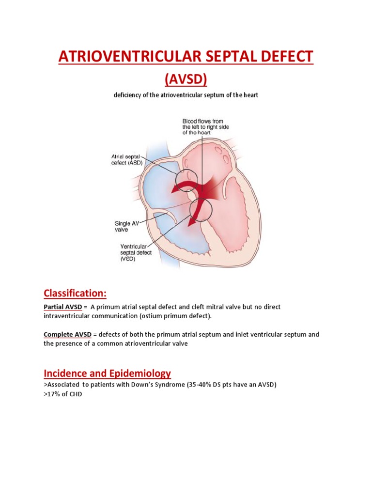 Also known as atrioventricular canal defects or endocardial cushion defects they account for about 5 percent of all congenital heart disease and are most common in infants with Down syndrome. Atrioventricular septal defect AVSD An atrioventricular septal defect results in a is a large hole between the upper filling chambers atria and the lower pumping chambers ventricles of the heart. They are characterized by a variable deficiency of the atrioventricular septum and abnormal atrioventricular valves AVVs.