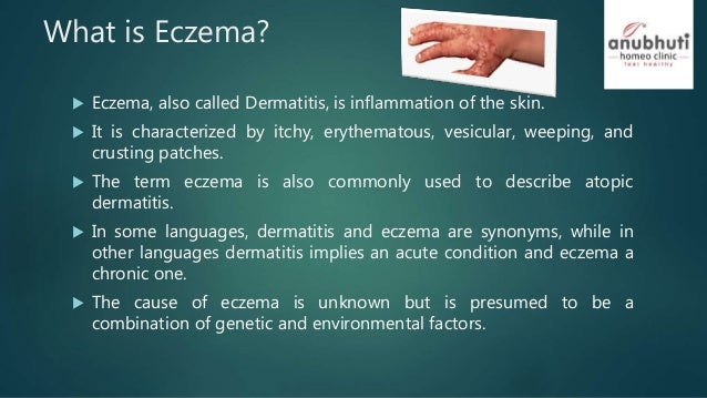 Typically appears erythematous edematous papular vesicular and crusted. Any superficial inflammatory process involving primarily the epidermis marked early by redness itching minute papules and vesicles weeping oozing and crusting and later by scaling lichenification and often pigmentation. Eczema eg-zuh-MUH is the name for a group of conditions that cause the skin to become itchy inflamed or have a rash-like appearance.